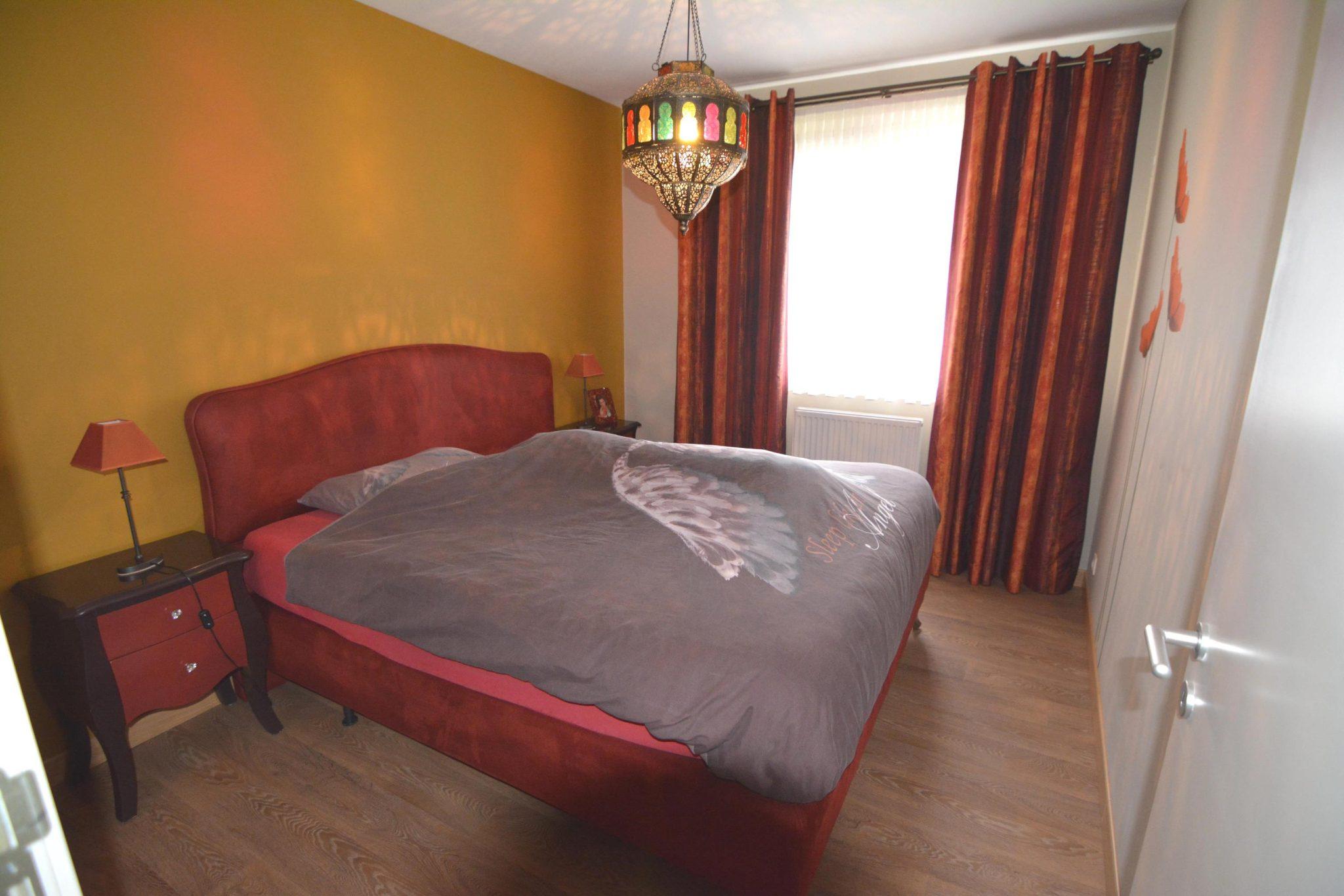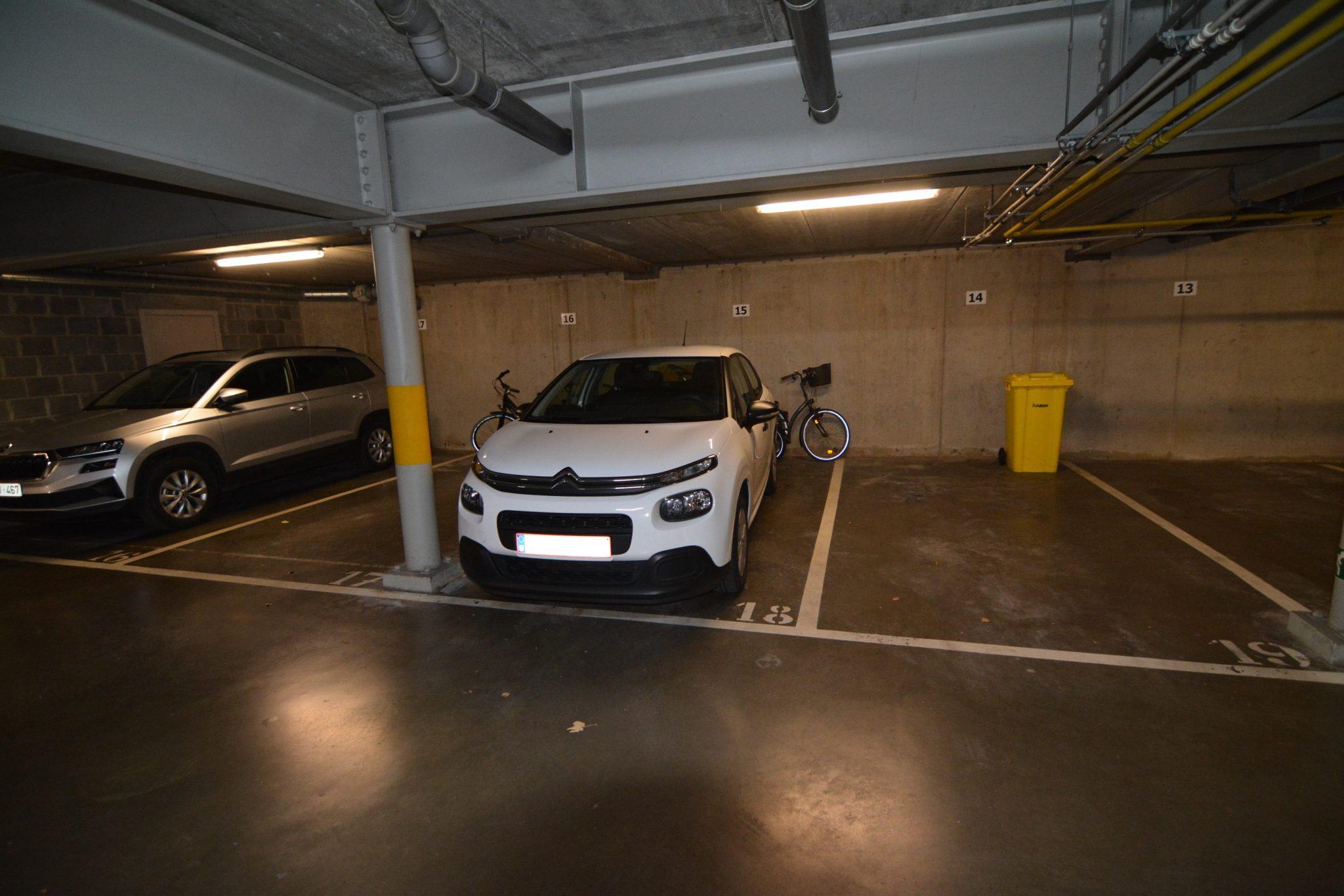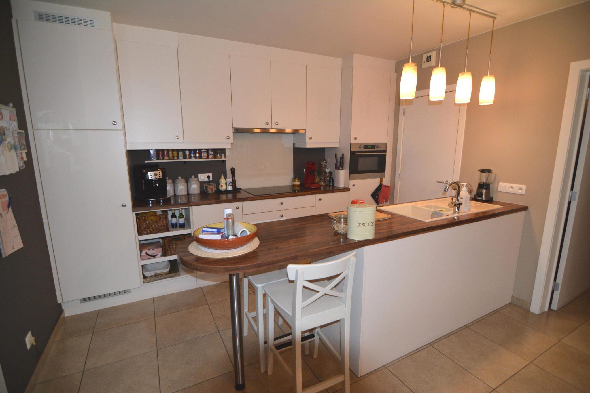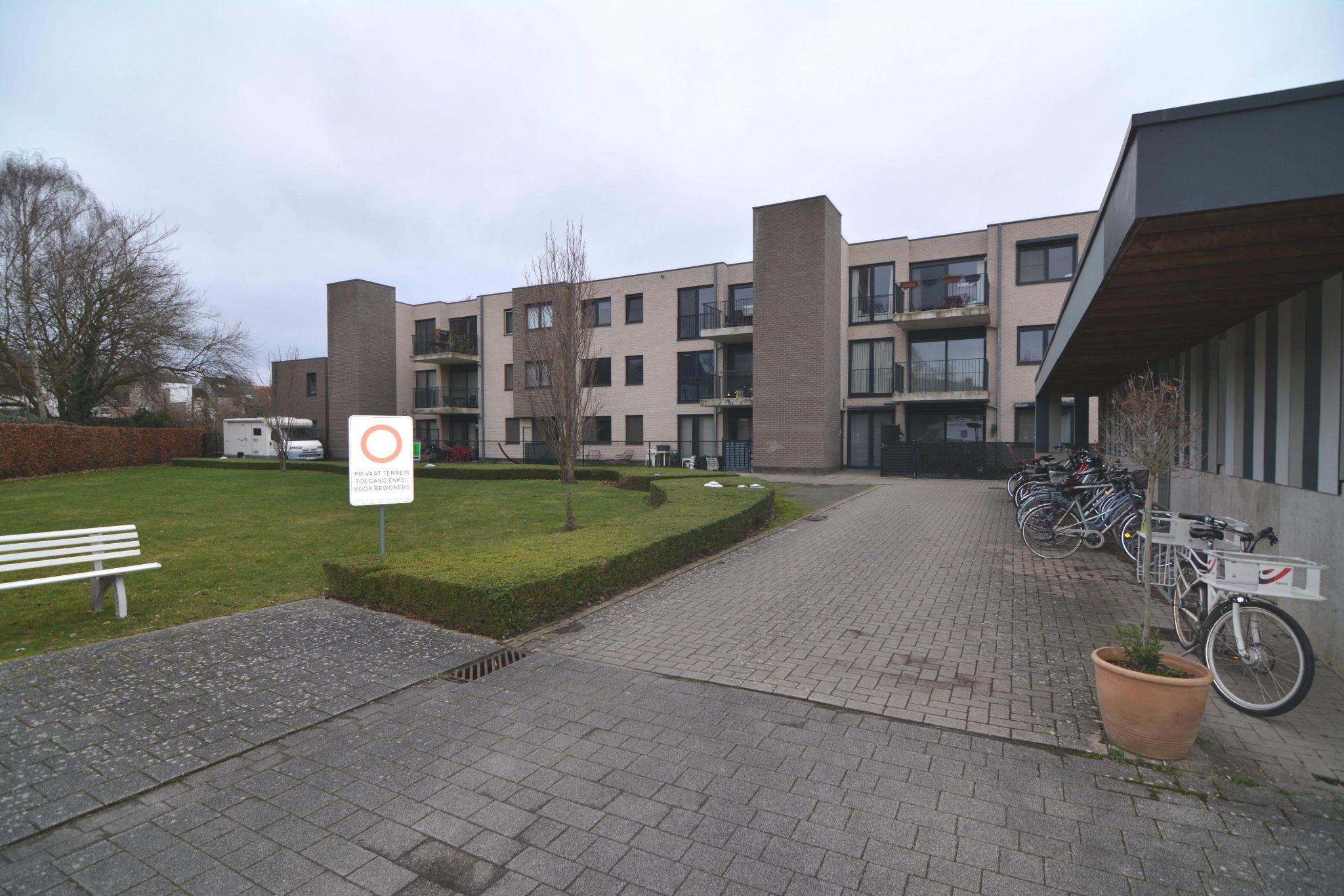 We betreden het gelijkvloers appartement via de inkomhal, deze komt uit in de ruime leefruimte, deze is voorzien van grote raampartijen over de volledige breedte met zicht op de tuin. Via een schuifraam heeft men rechtstreeks toegang tot de mooie omheinde tuin en het terras. De tuin is ook bereikbaar via een poortje en beschikt over een tuinhuis om spullen in op te bergen. Verder is er een open keuken met eiland, de keuken is volledig uitgerust en heeft toegang tot de berging. Via de nachthal bereikt men nog een apart toilet, twee slaapkamers en een badkamer met zowel douche als ligbad. Tot slot heeft het appartement een ondergrondse autostaanplaats en privatieve kelderberging inbegrepen in de prijs. Er is ook een gemeenschappelijke fietsenstalling en gemeenschappelijke tuin.
